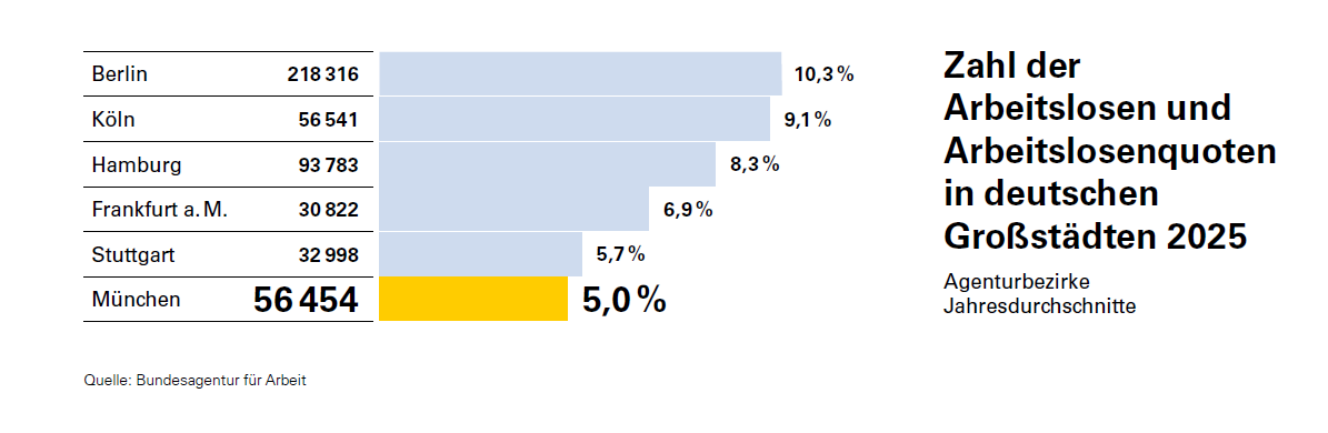Der Münchner Arbeitsmarkt hat seit vielen Jahren eine der niedrigsten Arbeitslosenquoten unter den deutschen Großstädten. Im Jahr 2025 lag die Arbeitslosenquote in München bei 5 Prozent.